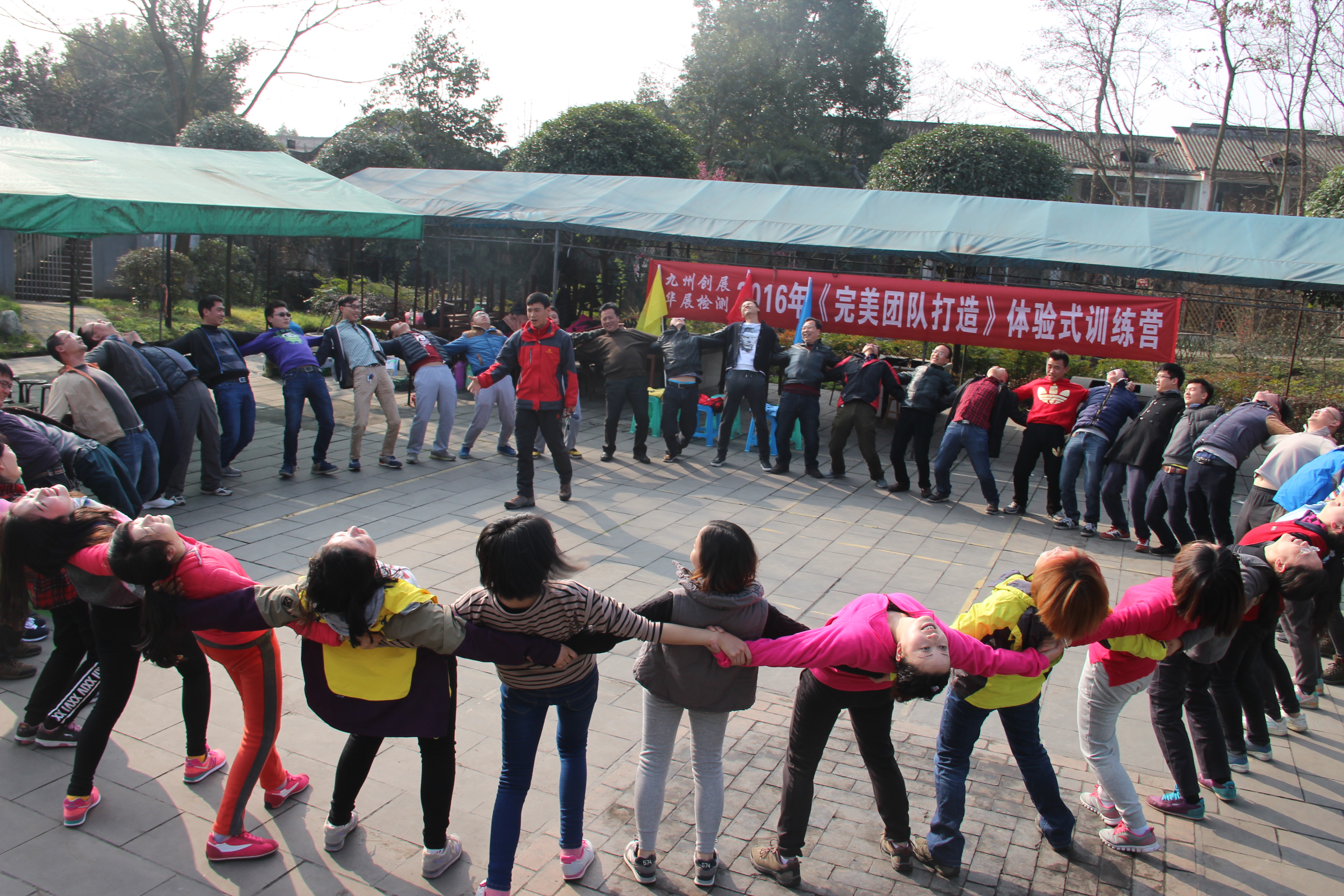 27日清晨,九州和華展全體員工整裝待發(fā),一路上歡聲笑語,不久就抵達(dá)了這次拓展訓(xùn)練的目的地。拓展訓(xùn)練隨著一個(gè)歡快愉悅的游戲活動(dòng)的開始也拉開了序幕,主教練母教練將全體人員分成了三個(gè)隊(duì),接下來的兩天時(shí)間,3個(gè)隊(duì)伍將為各隊(duì)的榮譽(yù)展開廝殺;每個(gè)隊(duì)需選出一名隊(duì)長和一名政委,帶領(lǐng)隊(duì)伍去贏得榮譽(yù),隊(duì)長的選取采取毛遂自薦的方式,通過發(fā)表演講,采取明主投票方式產(chǎn)生隊(duì)長,最終產(chǎn)生了3名優(yōu)秀的隊(duì)長:張薇、羊德兵、王偉平;每個(gè)隊(duì)要有自己的隊(duì)旗、隊(duì)歌、口號(hào)及隊(duì)伍造型,每個(gè)隊(duì)伍在隊(duì)長和政委的帶領(lǐng)下,群策群力,集思廣益,在不到10分鐘的時(shí)間內(nèi),創(chuàng)生了自己的隊(duì)旗、隊(duì)歌、口號(hào),分別是飛鷹隊(duì)、烈火隊(duì)、鯤鵬隊(duì);最終烈火隊(duì)?wèi){借“烈火、烈火,激情似火”,《你就像那冬天里的一把火》,以及整個(gè)隊(duì)的洪大氣勢贏得了3位教練的青睞,烈火隊(duì)在第一輪勝出。上午最后一個(gè)項(xiàng)目是6塊泡沫墊輪渡,要求是每只隊(duì)伍所有人通過6塊泡沫墊將所有人從起點(diǎn)輪渡到終點(diǎn),所有人的腳不能離開觸碰泡沫墊以外的地面,否則就會(huì)罰停10秒鐘。各隊(duì)在討論方案的時(shí)候,大家積極發(fā)言,建言獻(xiàn)策,爭取討論出一個(gè)最優(yōu)方案,討論完畢,比賽正式開始,3個(gè)隊(duì)伍齊頭并進(jìn),不過最終烈火隊(duì)?wèi){借10多秒的優(yōu)勢率先通過終點(diǎn),獲得第一名;烈火隊(duì)?wèi){借上午兩個(gè)項(xiàng)目的第一名暫時(shí)獲得上午項(xiàng)目的優(yōu)勝隊(duì),獎(jiǎng)勵(lì)則是到第三名的鯤鵬隊(duì)桌上端走一個(gè)菜作為戰(zhàn)利品。